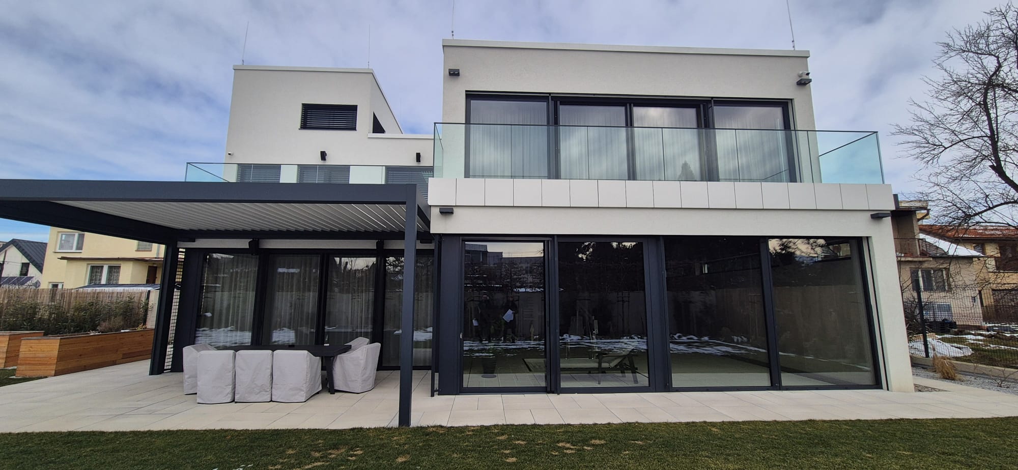 Veľkoformátové presklenia stierajú hranicu medzi luxusným interiérom a záhradou, pričom plynule nadväzujú na priestrannú terasu s modernou pergolou.